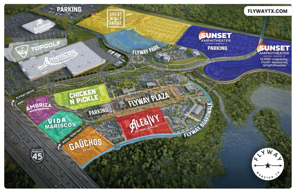 Perfectly positioned midway between downtown Houston and sun-drenched Galveston, a new destination is taking shape along I-45 in Webster’s southeast quadrant. Flyway is unfolding with iconic entertainment, dining, recreation, and sports entertainment venues anchored by the region’s only Great Wolf Lodge indoor waterpark resort hotel and conference center, alongside Sunset at Houston—a new 12,500-capacity, multi-seasonal amphitheater engineered for year-round live entertainment with a dramatic canopy roof, wind walls, and state-of-the-art AV systems.