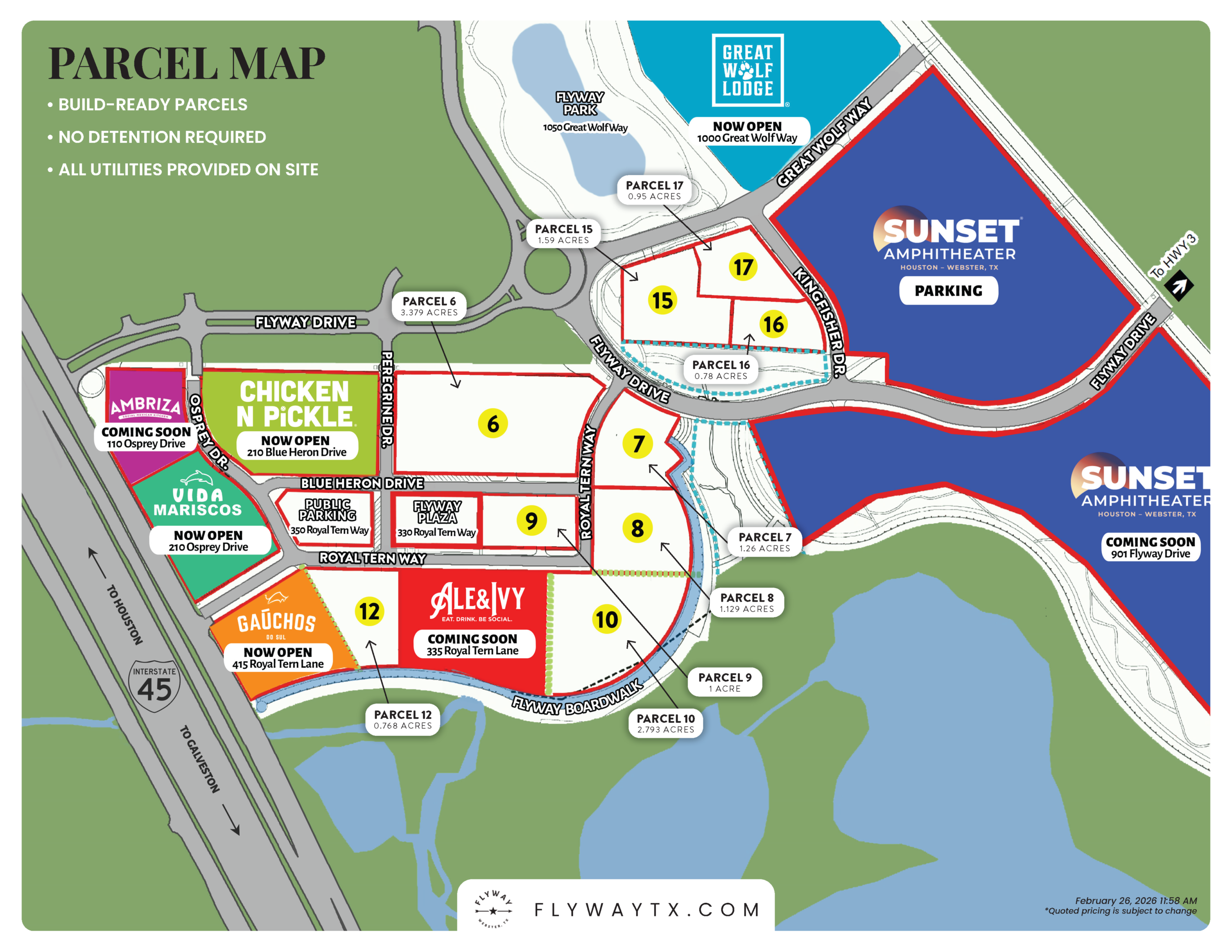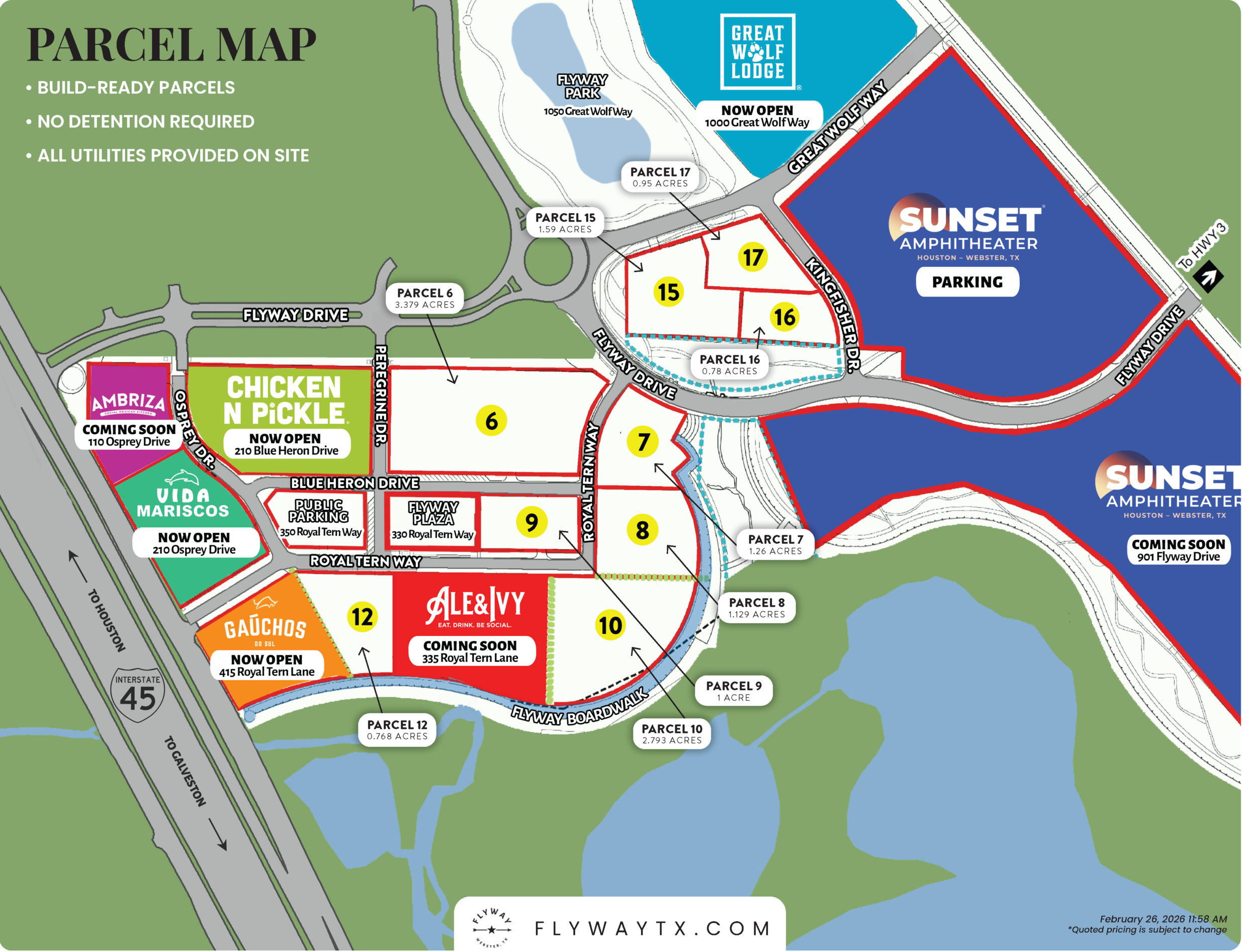 At Flyway in Webster, the City is offering a limited number of build-ready parcels within a one-of-a-kind entertainment and hospitality destination. Parcels are available for purchase by individual owners and are fully prepared for development—no detention required, with all utilities provided on site.